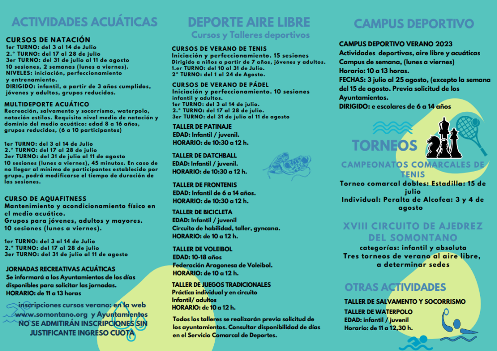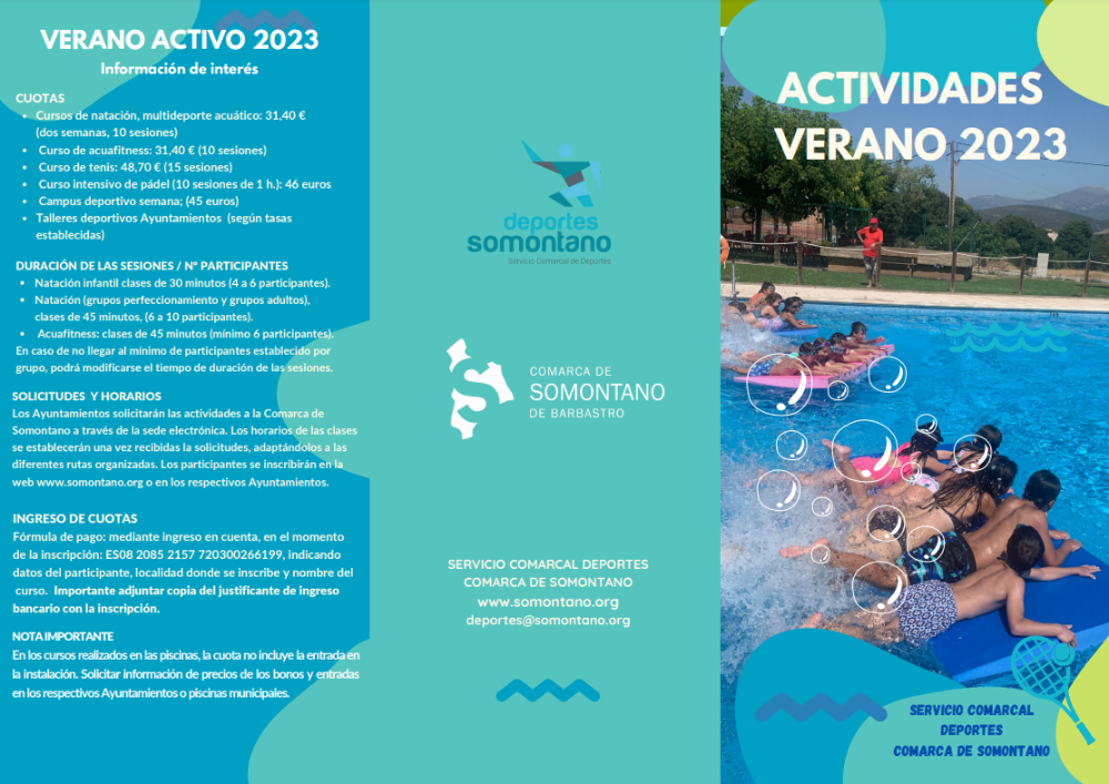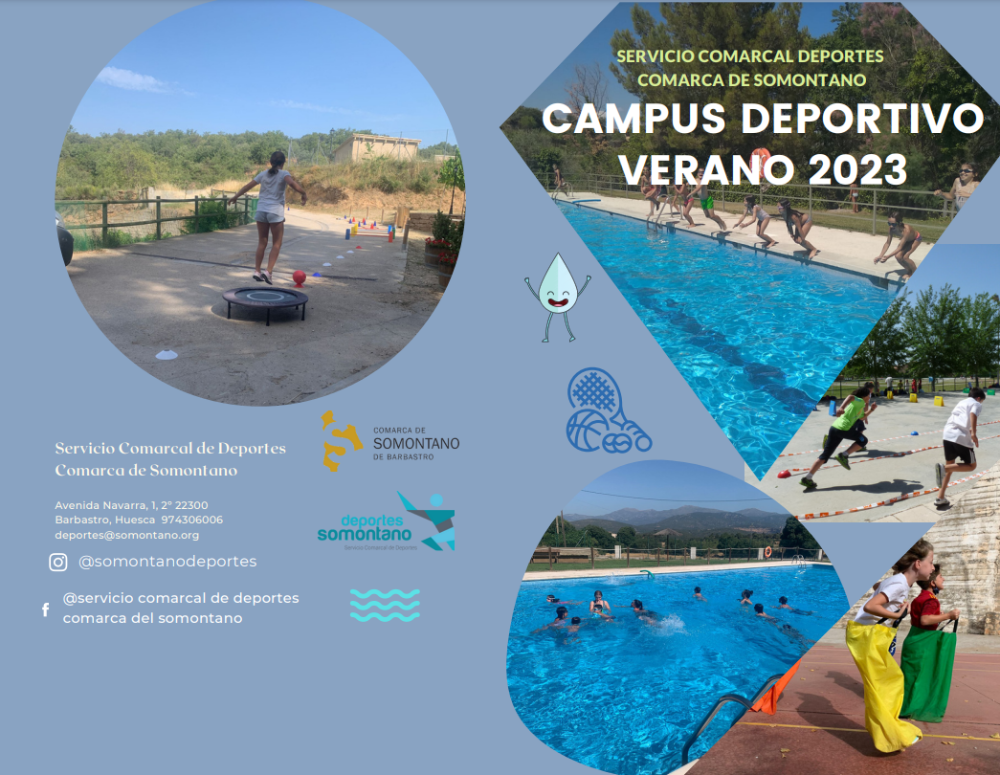Las actividades de cada municipio se organizarán previa solicitud de los Ayuntamientos, estando ya abierto el plazo para que los Ayuntamientos las puedan solicitar en la sede electrónica de la Comarca de Somontano. Cursos de natación, multideporte acuático, aquafitness, campus deportivo, cursos de tenis, cursos de pádel, jornadas recreativas acuáticas, talleres deportivos en diferentes modalidades, (patinaje, dachball, multideporte, voleibol,