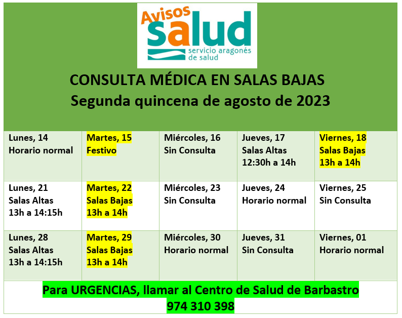 Horario de la Consulta Médica Whatsapp: Horario de la Consulta Médica Fecha 15 agosto 2023 Segunda quincena de agosto de 2023 El Ayuntamiento informa de los horarios de la Consulta médica durante la segunda quincena del mes de agosto de 2023. Documentos Horarios de la Consulta médica en salas Bajas durante la segunda quincena del mes de agosto de 2023. (pdf 93,7 kB) Galería imágenes cat: Ayuntamiento, vaobulcary: 3670645